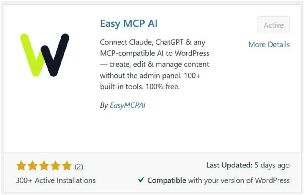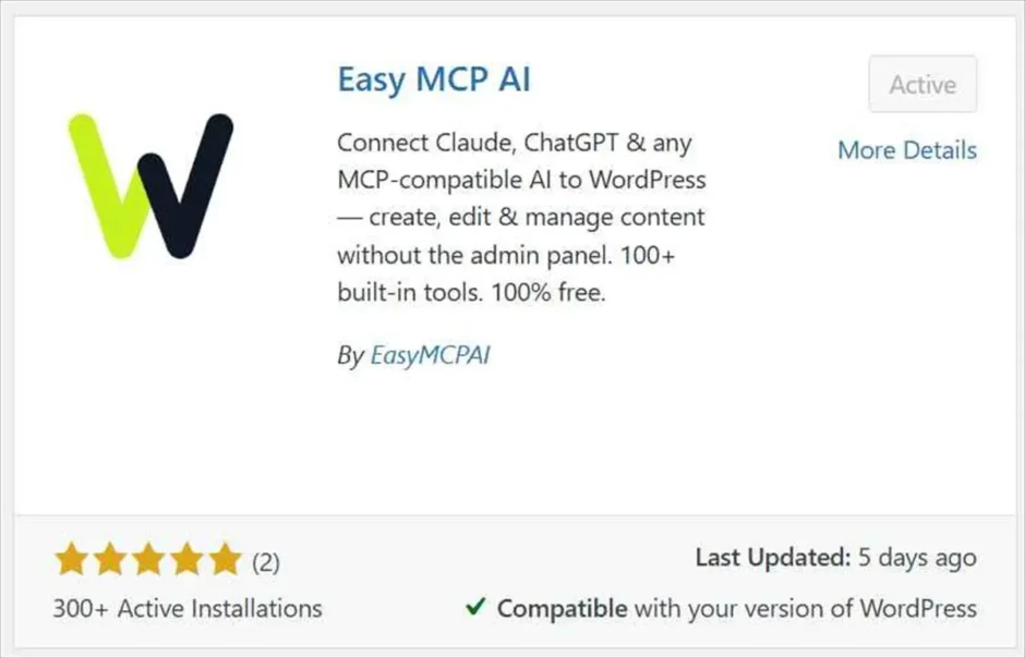 WordPressとClaudeを繋ぐには、サイト側にMCPサーバーの役割を果たすプラグインが必要です。今回はWordPress公式ディレクトリから無料でインストールできる「Easy MCP AI」を使いました。管理画面のプラグイン追加画面で検索してインストールするだけなので、この部分は特に問題なし。