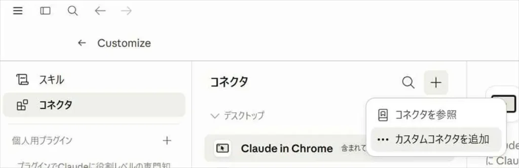 Claude Desktopには「コネクタ」という機能があり、カスタムコネクタとしてMCPサーバーのURLを登録できます。ダッシュボードの「Claude.ai」セクションに表示されているURLを使えばいいのかと思い、まずこちらを試しました。