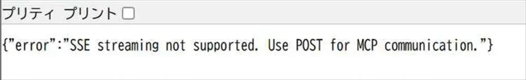 ブラウザで直接URLを開くとこのエラーが。Claude.aiのコネクタ機能はSSE方式を期待しているが、Easy MCP AIはPOST方式のため非対応
