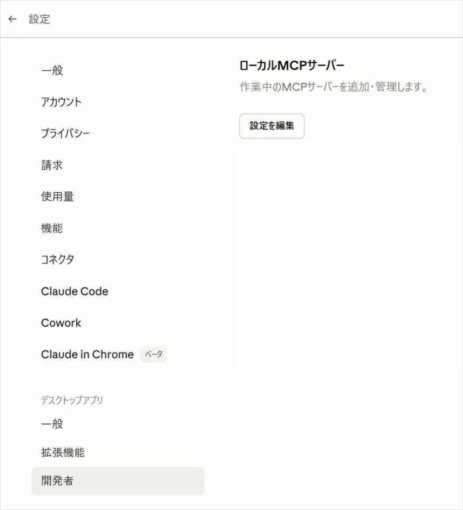 結果的に見つけた方法は、Claude Desktopのメニューから直接開くことでした。「ファイル」→「設定」→「開発者」→「設定を編集」ボタン。これがいちばん確実です。