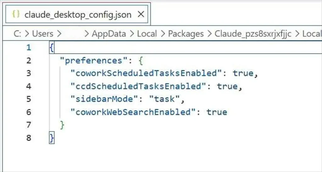 ファイルを開くと、すでに設定が書かれていました。Claude Desktopの設定(preferences)が入っているので、これを丸ごと上書きしないよう注意が必要です。