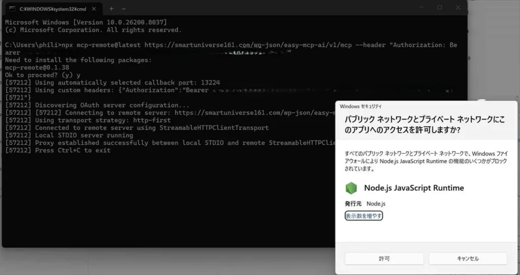 接続成功のログが流れる途中でファイアウォールの許可ダイアログが出現。「許可」を選択する