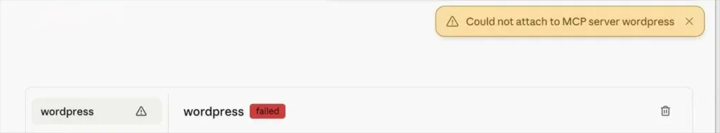 Could not attach to MCP server wordpress / wordpress failed