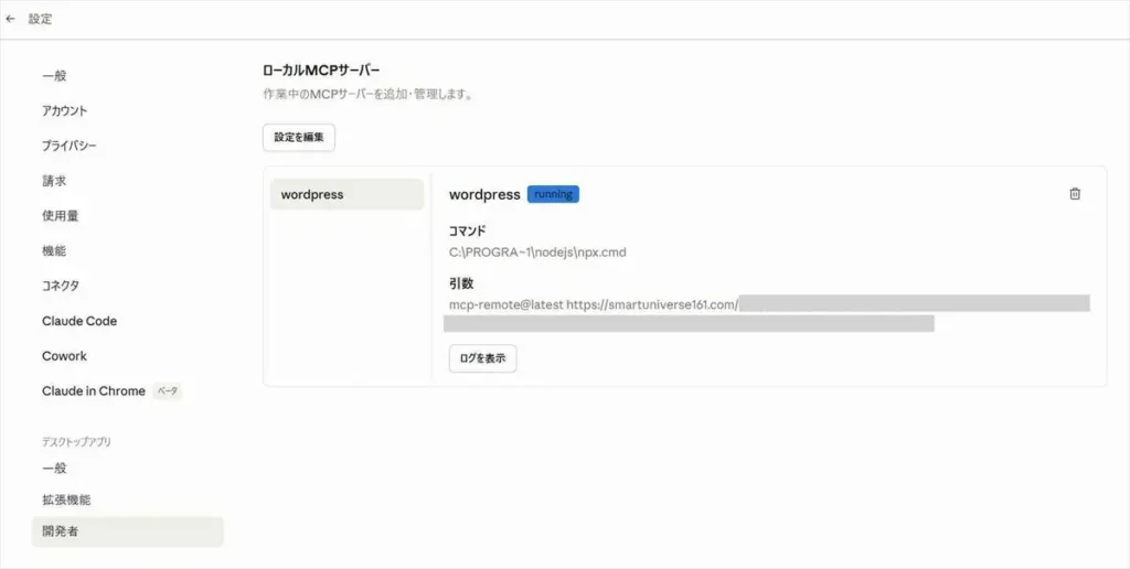 設定を保存してClaude Desktopを完全に終了(タスクバーのアイコンを右クリック→終了)してから再起動すると、開発者設定に「wordpress: running」と表示されました。