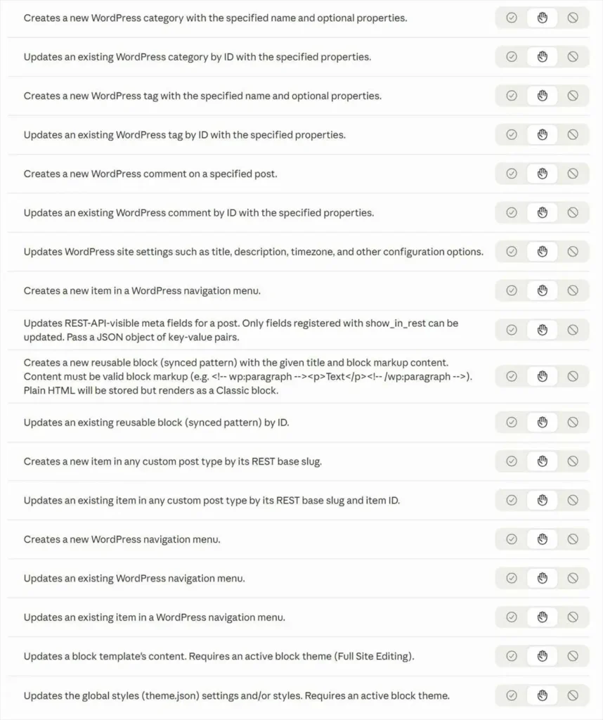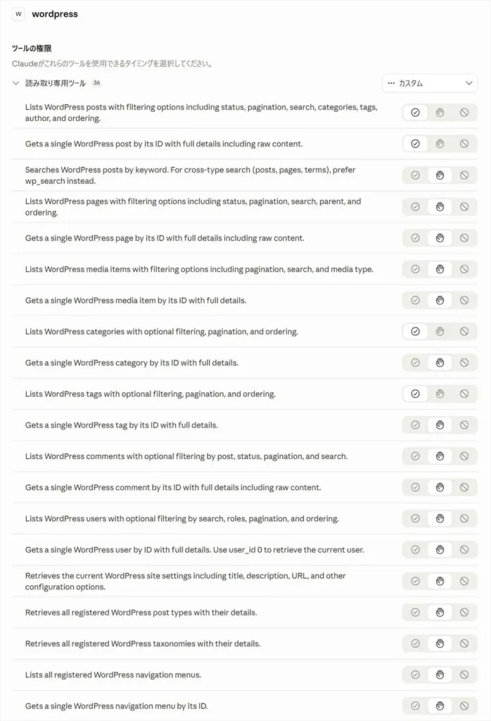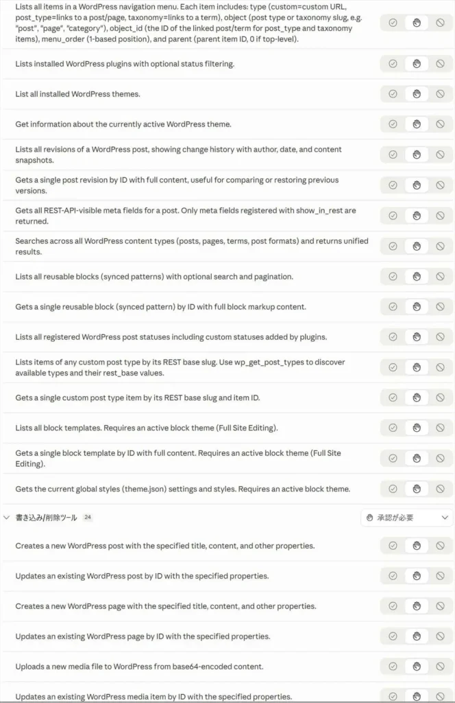接続が確立すると、ClaudeからWordPressを操作できるようになります。「最新5件の記事を見せて」と話しかけるだけで、wp-adminを開かずに記事の一覧が返ってきます。設定画面で確認できるツールの権限一覧はこちら。